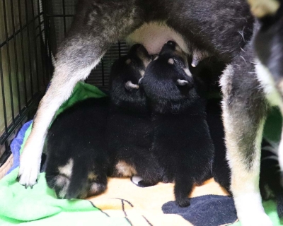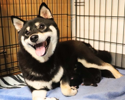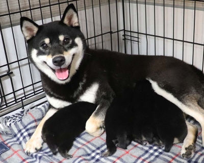 2022年4月15日に黒柴父犬、豹吾と黒柴母犬、かこの間に黒柴犬雄3 黒柴犬雌1が生まれました。子犬情報ページをご覧下さい。